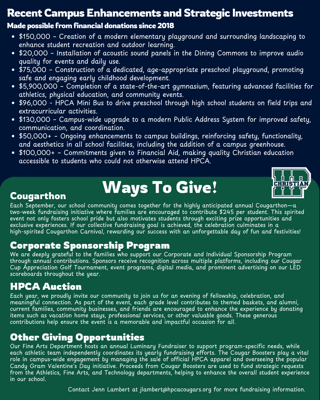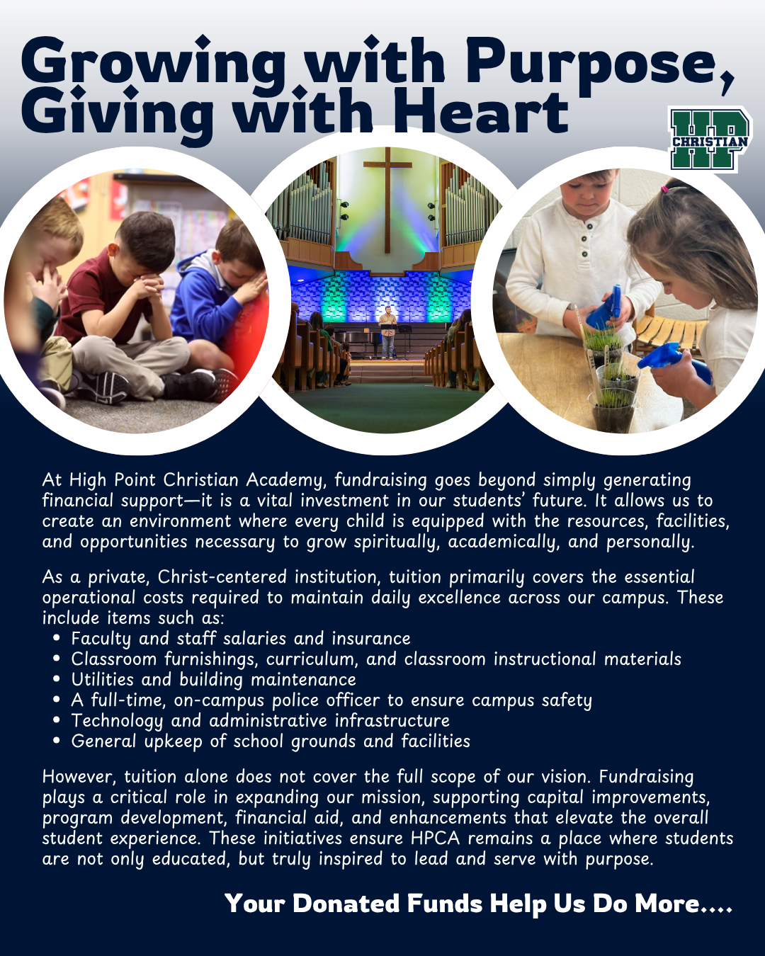 Throughout the year, additional funds are raised to meet specific needs, ranging from athletics and fine arts to mission trips. These targeted gifts directly enhance the student experience, both on campus and in the wider community.